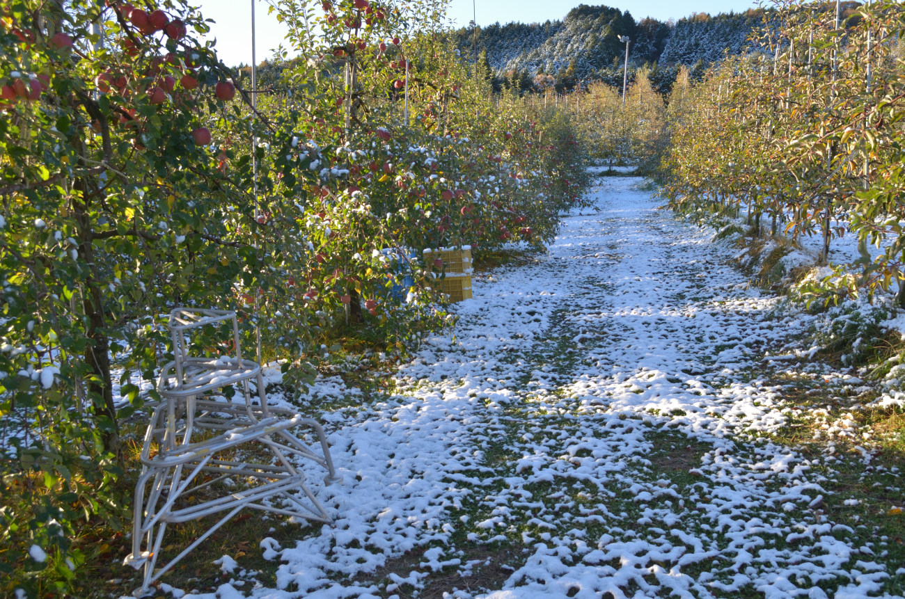 サンふじは収穫最盛期に入り、町のアグリ支援の皆さんに協力いただきながら収穫作業を進めています。 昨日降った雪で、今朝の果樹園は積雪が見られましたが、日中の暖かさでお昼頃には全て融けてくれました。この先数日は暖かい日が続きそうですので収穫が捗ることを願います。
