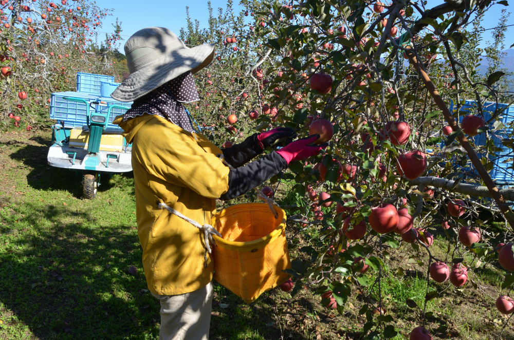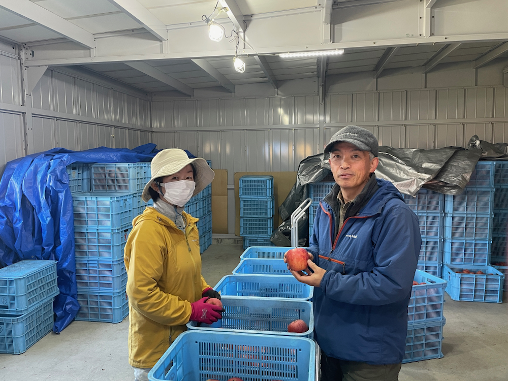晴天が続きサンふじの収穫作業が捗っています。今年は新たにアルバイトの皆様に加わっていただきながら私たちと共に収穫を行なっています。今年は3割から4割収穫量が少なく、これまで以上に一玉一玉丁寧な収穫を行なっています。果実の品質は、全体に小玉傾向で、ツル割れとスレ傷が過去一番少ない年になりそうです。また、早期落葉等の影響による加工向け果実が多いと感じています。貴重なサンふじ果実を大切に収穫してまいります。