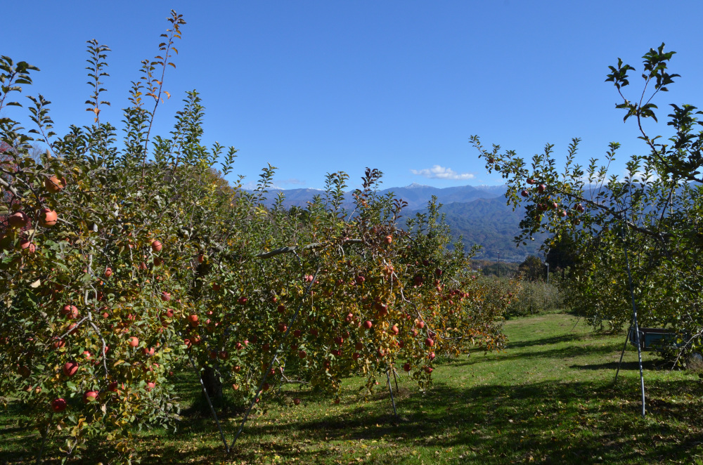 サンふじは収穫を終了し、選果作業を進めています。今年は収穫量は少ないながら、台風によるキズ果やツル割れがほとんど見られず、商品化率が上がり、特に台風被害が無かったことに救われています。収穫を終えた果樹園では緑色の葉がまだまだ見られ、いつ紅葉するのか?また、里の紅葉は今が最盛期です。遅い遅い秋の訪れです。