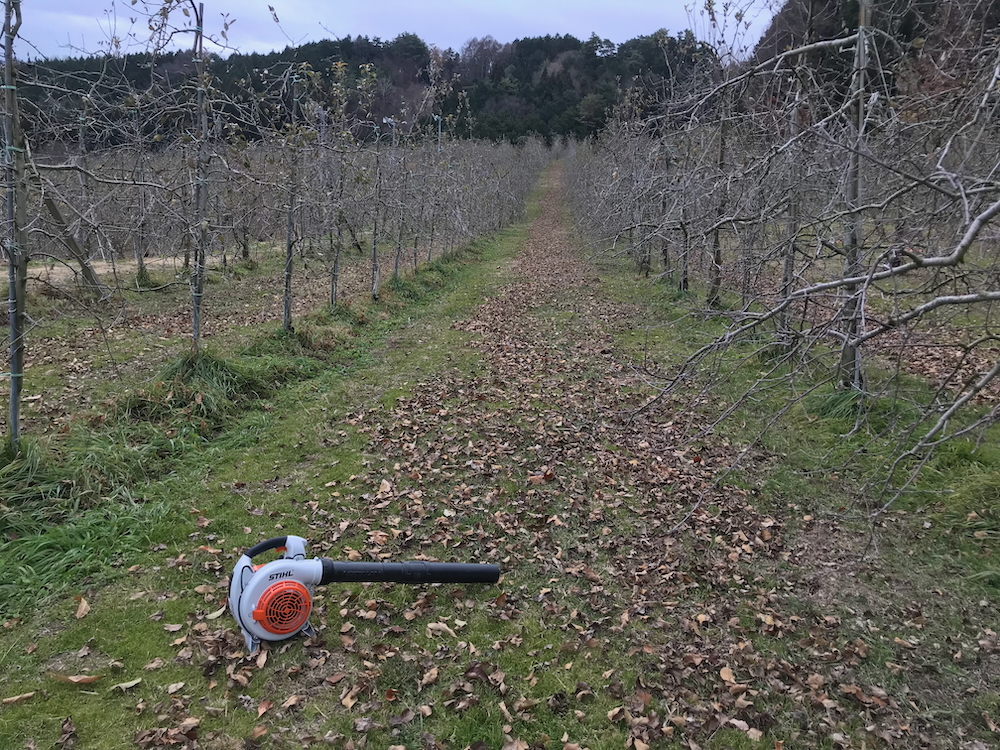 サンふじの荷作り発送の作業がひと段落し、果樹園を見渡すと、落葉が進んでいました。今年は黄葉せずに枯葉が落ちる景色となりました。そこで、来年の褐斑病源となる落ち葉を集めて粉砕処理することとしました。本来であれば、集めて焼却処理するのが良いと思いますが、火の管理に不安があるので、この方法をとっています。例年は草刈機を走らせて粉砕処理を行いますが、今年は初めてブロアーを使用して木の元にある落葉を通路に出して処理することにしました。木の元に落葉が多くある事がわかりました。